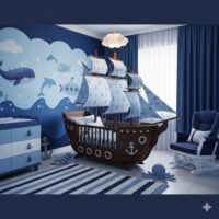 Màu xanh nước biển, hãy kết hợp với chiếc giường hình con tàu, các bé sẽ có cảm giác đang trải nghiệm một chuyển phiêu lưu thú vị trên đại dương.